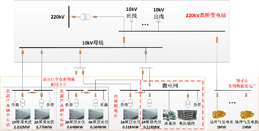 南京江宁众彩物流配送中心分布式屋顶光伏微电网示范工程主要包含光伏发电、垃圾发电机组、冰蓄冷系统、电池储能。系统架构图如下: