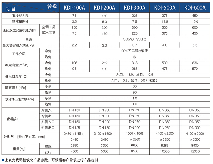 高菱模块化动态制冰机组 基于过冷水式动态冰蓄冷系统较为复杂的工艺设计、高标准的设备和零部件加工要求和高可靠性的自控系统设计要求,高菱采用模块化设计思路,将过冷水式动态冰蓄冷系统中最核心和可靠性要求最高的工艺和设备集成为模块化动态制冰机组,在工厂内完成机组的加工、装配、检验和测试,确保机组的技术参数和整体质量达到设计规范要求,同时大幅降低现场安装施工的难度。 高菱动态制冰机组具有KDI-100A、KDI-200A、KDI-300A、KDI-500A、KDI-600A的多款标准产品,与市场主流品牌的双工况主机的制冷能力相匹配,为冰蓄冷系统的前期设计选型带来极大的便利性。同时,高菱动态制冰机组也提供非标产品的设计和生产,满足各类用户的特殊要求。