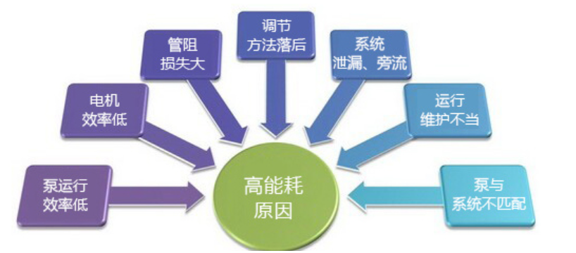 图1:水泵能耗高的原因 二、水泵系统节能改造的主要原理 淘汰更换役龄过长、效率低下的机泵设备,采用高效节能永磁电机,保证泵在高效区运行; 通过优化泵水力设计和结构设计,提高制造精度,提高泵本身的效率; 通过优化配套电机及传动装置,提高电机及传动装置的效率; 通过电机、传动装置、调速装置、管网及用水设备匹配的优化设计,提高装置效率; 合理优化系统运行模式,彻底降低无效能耗。 三、永磁电机介绍: 永磁电机是一种新型永磁电机,由于永磁体的高磁能积和高矫顽力(特别是高内禀矫顽力),使得永磁电机具有体积小、重量轻、效率高、特性好等一系列优点。早期由于成本较高,一般应用于航天、国防、精密机械加工等高端行业。 随着生产成本的降低,我司将其应用于水泵领域,与特别设计的泵体结合,有效的降低传统水泵的能耗,并且提升了使用寿命。 随着电力电子技术、新型电机控制理论和稀土永磁材料的快速发展,永磁同步电动机得意迅速的推广应用。永磁同步电机与普通异步速电机相比,具有明显节能优势。