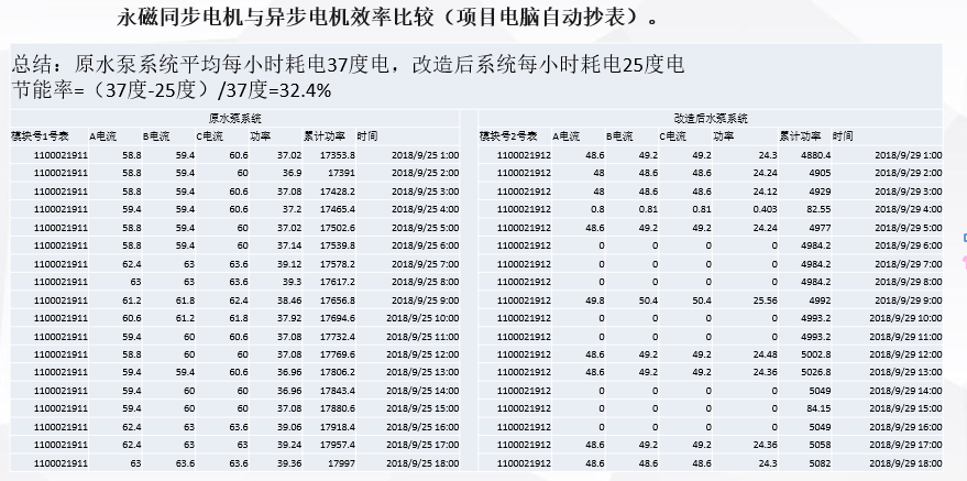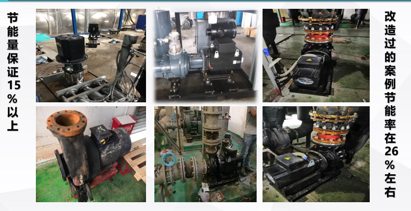 未经变频改造的异步电机水泵,我司承诺15%以上节能率! 一、高效永磁电机水泵,节能15%-60%,快速回收成本。 我司在蓄冷空调整个系统研发中发现,水泵占用整个系统的能耗较大部分,而一般认为水泵的电能属于固定消耗,很难减少。经统计,电机系统的能耗占全国用电量的60%,泵和风机设备作为一种通用机械,在国民经济各个领域中得到了广泛应用,其用电量约占全国用电量的1/3。我国没有改造的风机、泵类产品效率平均比国外低2%~5%,而整个风机水泵系统的效率要低20%左右,因此,具有非常大的节能潜力。