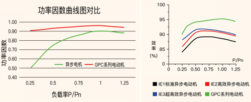 2.永磁电机特点介绍: A、超高效率,且低负荷状态效果远高于传统电机。 效率高,功率因数高,宽经济运行范围。 独特的定转子设计,拓宽了高效区域、有效降低损耗[温升低],符合IE4能效标准。 异步电机在35%额定负载附近效率迅速下降,25%额定负载时功率因数从额定负载时的0.85左右迅速下降到0.5以下;GPC永磁同步可以在25%-120%功率范围内保持高效率和高功率因数运行,25%额定负载时功率因数仍可达到0.9以上。