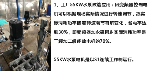 轴向长度缩短10%-30% ①尺寸小、重量轻 ②高负载能力、大峰值扭矩 ③高动态响应 ④正弦化波形、扭矩脉动低 C、启动转矩大,电流小。 异步电机启动过程中,启动转矩小,启动电流却很大,对电网冲击较大,在频繁启停场合有绕组过热风险。永磁同步电机的主磁场恒定,定子电流几乎全部为有功电流,启动电流小,启动转矩大。 D、场地适应性强 全封闭结构,无灰尘杂质干扰,保证电机内部清洁,延长使用寿命。 E、散热能力更强 机壳材料选用优质铝材,采用先进的铝锭挤压拉伸和时效处理,散热能力和结构强度更好。内置过温保护传感器,配合变频器实现自我保护。 四、部分改造案例: 1、工厂55kw水泵改造应用: