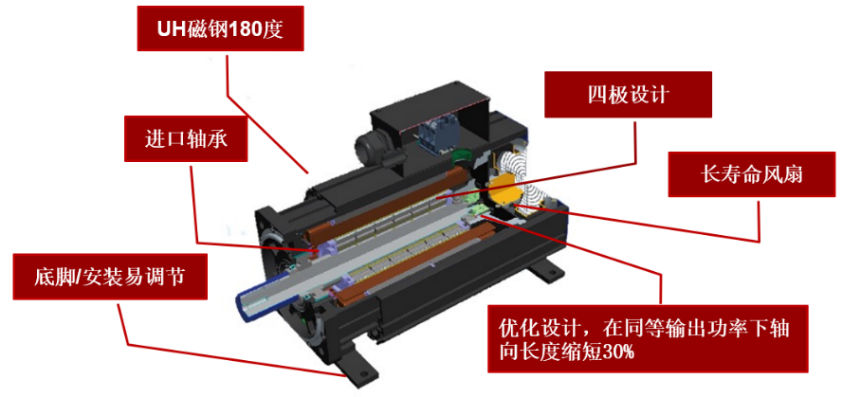 B、体积小重量轻,同功率体积缩小50%。 由于使用了高性能的永磁材料提供磁场,使得永磁电机的气隙磁场较感应电机大为增强,永磁电机结构紧凑,体积大大缩小,可有效节省空间。